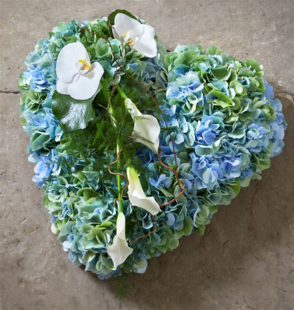 Baby blue hydrangea creates a soft cradie for beautiful orchids and calla lilies withis the small love hearts.This serence and special tribute for a baby or child reflects cherished memories of denderness.